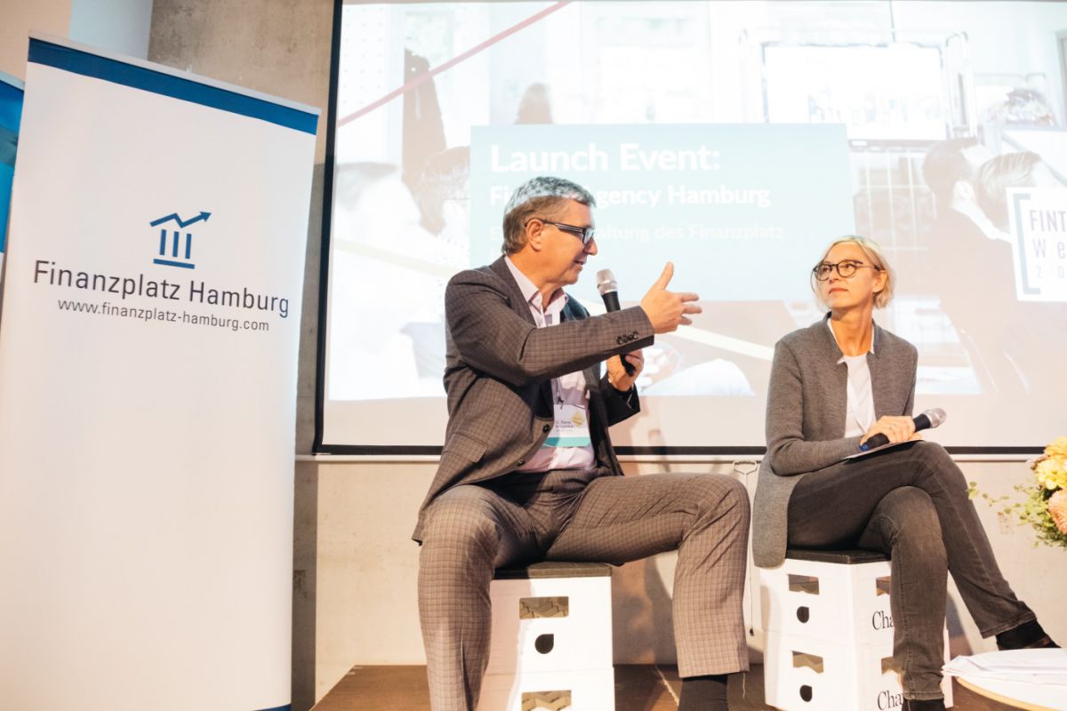 Auf der Bühne erläuterten Dr. Reiner Brüggestrat, stellvertretender Vorsitzender des Finanzplatz Hamburg e.V. und Dr. Rolf Strittmatter, Vorsitzender der Geschäftsführung der Hamburg Marketing GmbH wie es zur Idee der Agency kam und was die Partner sich davon versprechen.